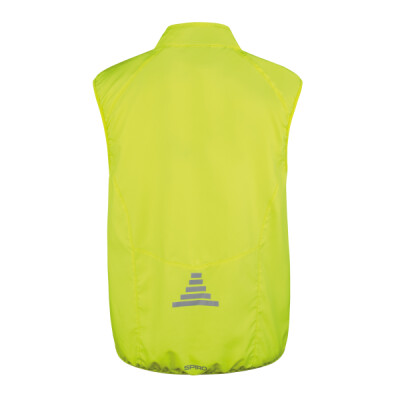 Lightweight, breathable and windproof. Ideal layer garment. Comfort fit. Unisex fit. Quick dry. Longer fit aids cycling position contour. Reflective prints for enhanced visibility. Pocket free. Reflective print front and back. Full front zip with reflective panel. Stand up collar. Longer back panel.
