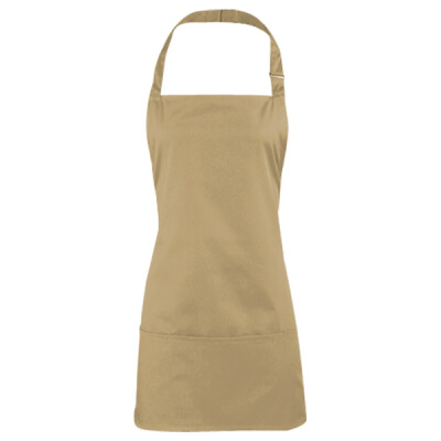 3 Pocket short bib apron (Length 62 cm, Width - 60cm). Self fabric neck with adjusting buckle. Self fabric 90cm ties. Doubles over, neck ties are secured away to form waist apron. 60ºC Wash. Size One size